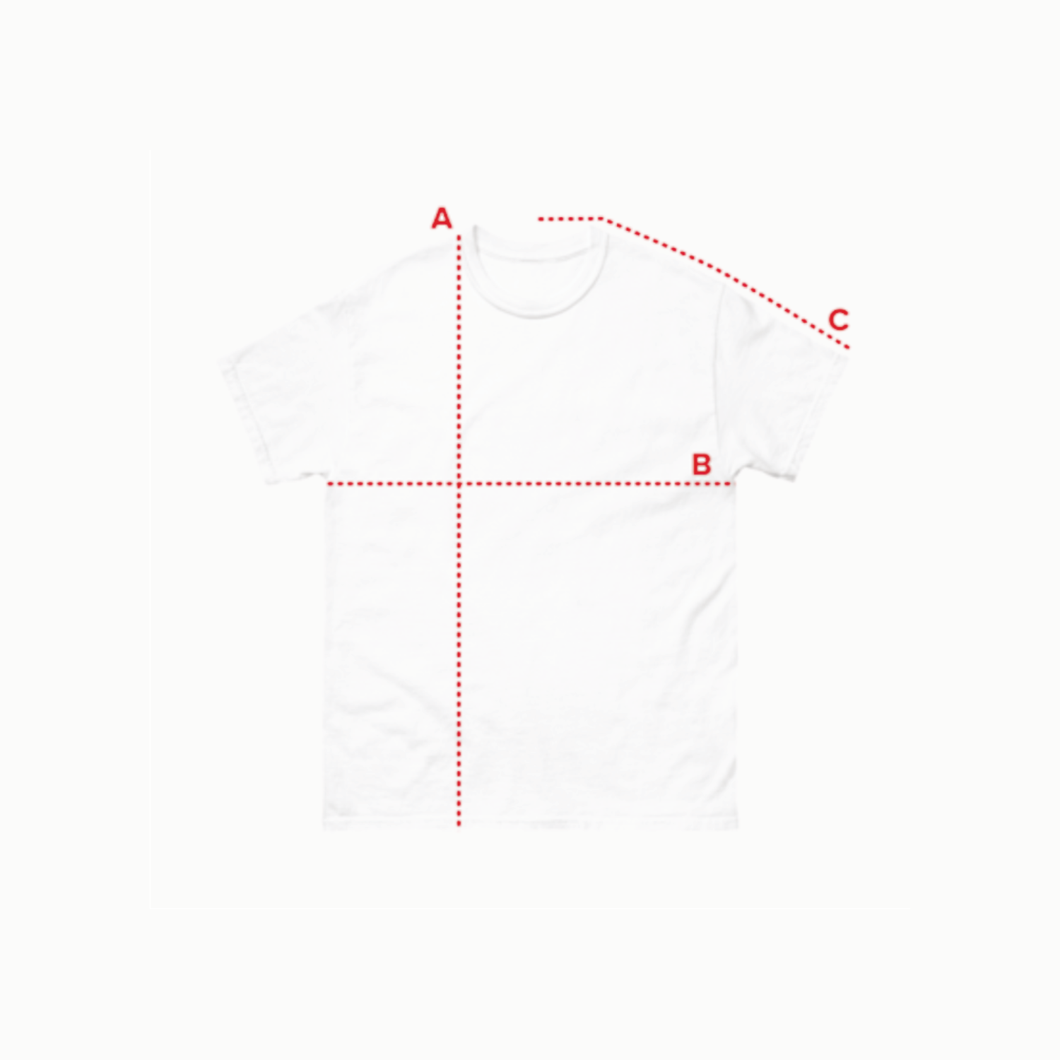Place the end of the tape beside the collar at the top of the tee (Highest Point Shoulder). Pull the tape measure to the bottom of the shirt.